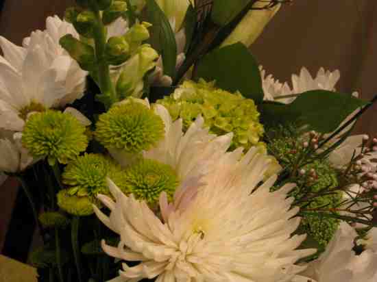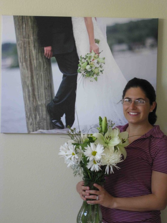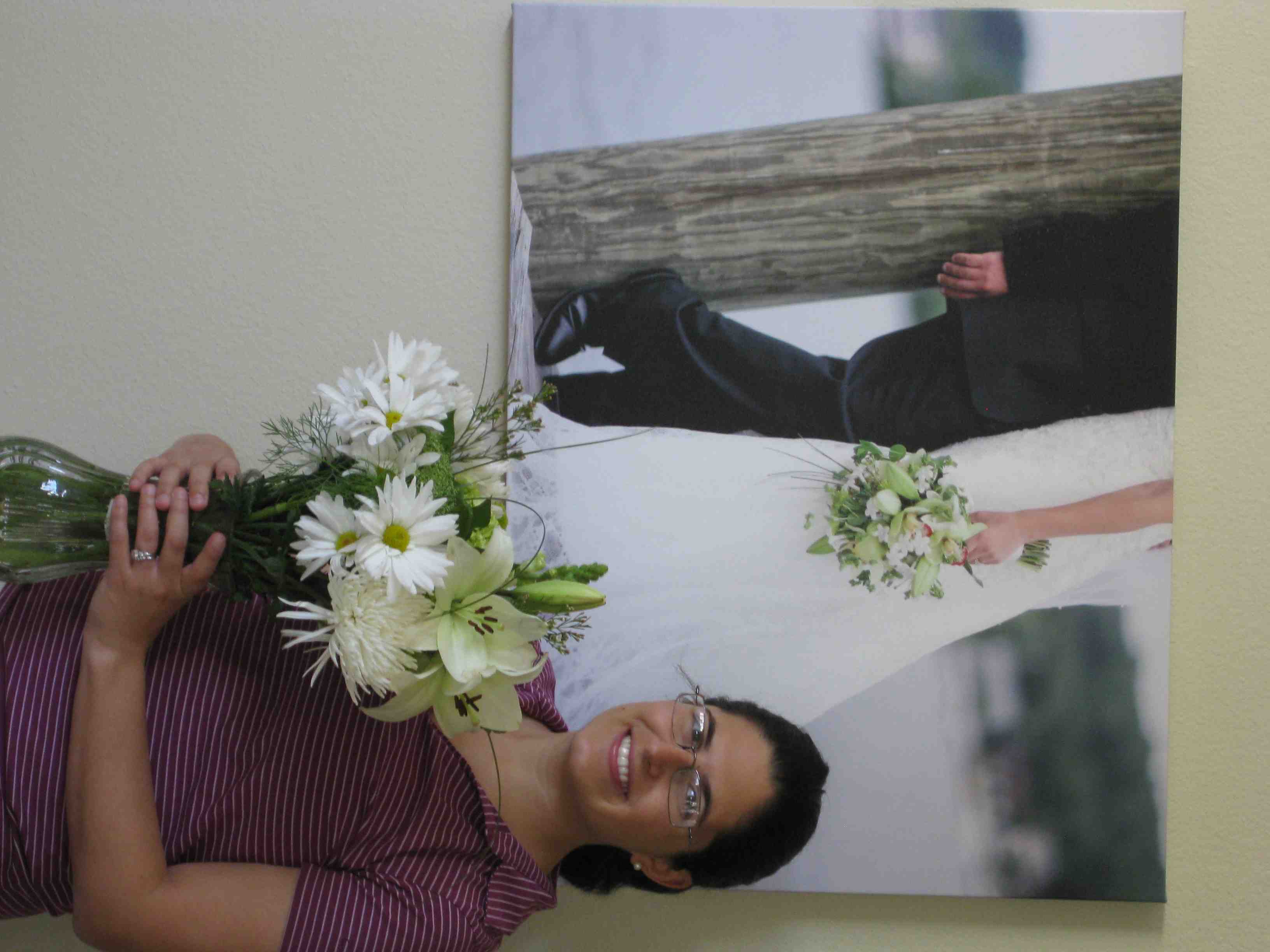 I LOVE, LOVE LOVE these types of flowers (Button Mums, Spider Mums, Daisies and Lilies!) because that is what was in my wedding bouquet!!! I got so excited, that I had to take a picture in front of my wedding canvas to compare!