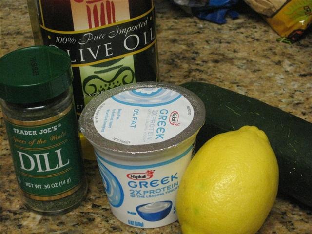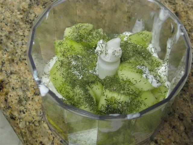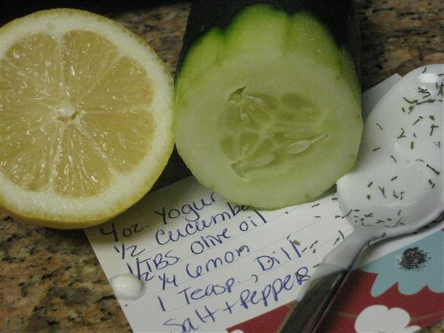 I just put some Greek yogurt, cucumber, olive oil, lemon juice, dill, salt and pepper in my food processor and give it a whirl. (Those are my favorite recipes: take some ingredients and mix em’ together.)