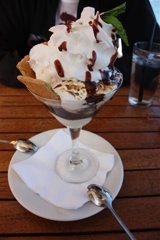 S’mores sundae! It had ice-cream, toasted marshmallows, chocolate sauce and whipped cream. And it had graham crackers along the edge. YUM! ![]()