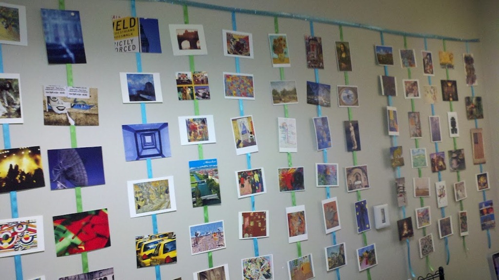 And if that wasn’t enough crafting for one week… I worked on finding a way to display my postcard collection! When I was in Europe, I started buying postcards of the art I saw in museums. Over time, I ended up with a whole shoebox full of great photographs and art. It was a shame it was sitting on a shelf. So I bought some ribbon and hotglued them to it and hung them on a blank wall. I LOVE it! ![]()