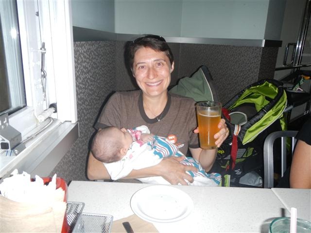 And for dinner, we walked over to a local burger joint. EJ would like to point out her fine babysitting skills. Baby in one hand… beer in another. #winning ![]()
