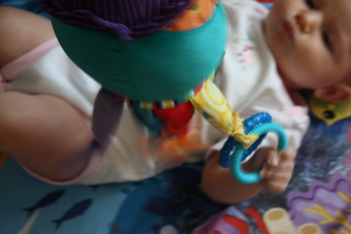 New this week! Adele found her hands! She’s been grabbing for things and holding on like a champ! So fun! ![]()