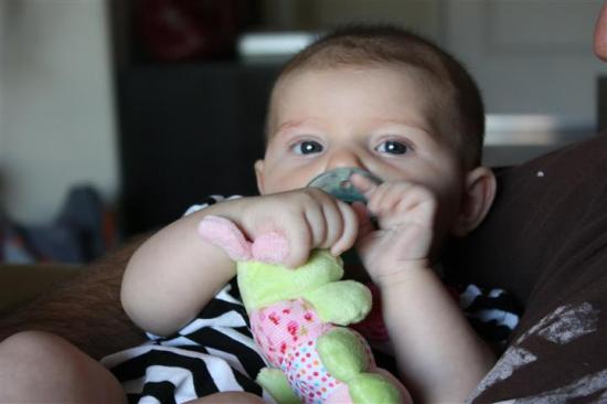 The biggest change this month is that we can distract her now! It’s easy to hold her attention with toys, songs or funny faces. She’ll stop what she’s doing to look at us. When she cries, we can sing and she’ll stop to pay attention. We can manipulate her mood with silly voices. This has been extremely helpful in the car too! She no longer screams bloody murder in the car seat. In fact, she actually enjoys it now. She looks out the window, she plays with her hanging toys, and she smiles when we sing to her. I have an Old MacDonald Pandora station on my phone and computer now. It’s crazy how all those old childhood songs come back to you when you hear them again 20 years later. Down by the bay…. Where the watermelon grows…..