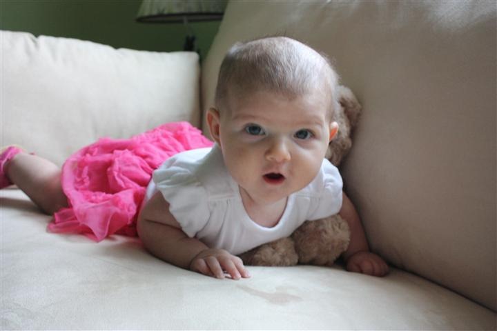 I had fun taking Adele’s four month photos this weekend. She no longer stays where I put her. She can’t crawl yet, but she’s determined to move any way she can.