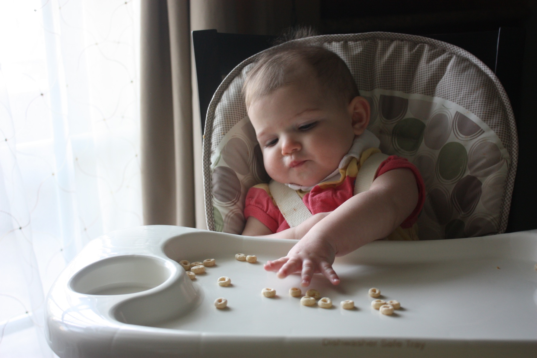 Even though she’s early for the “pincher” grasp, she’s become quite skilled at getting those little ‘O’s” into her mouth. She is very determined, and she has a lot of patience. She’ll work at it til she gets it right. It’s pretty impressive.