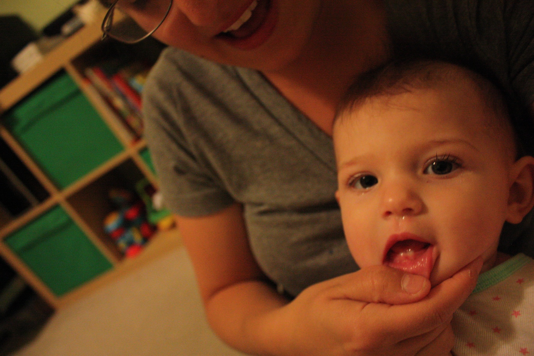 Then it dawned on me. Mild Fever + Runny Nose + Whiny Baby = TWO NEW TOP TEETH! Poor girl! She cut two new teeth in one day! I couldn’t get a picture of them, but here’s the bottom ones!