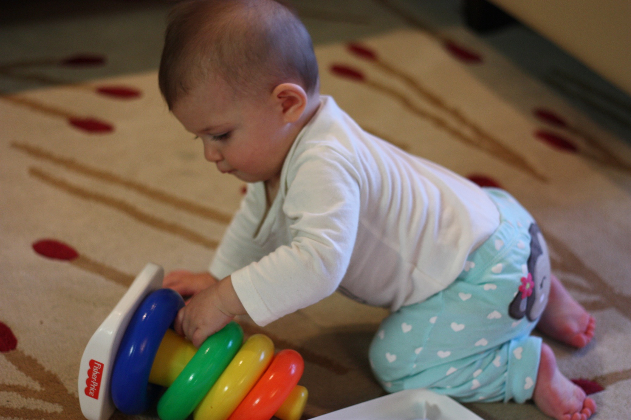 She’s still loving my magical box of toys. She hasn’t gotten bored with it yet, but I think we need to start mixing it up a little bit in the next month or two. But like most babies, she’s way more interested in our phones, keys and shoes more than anything else.