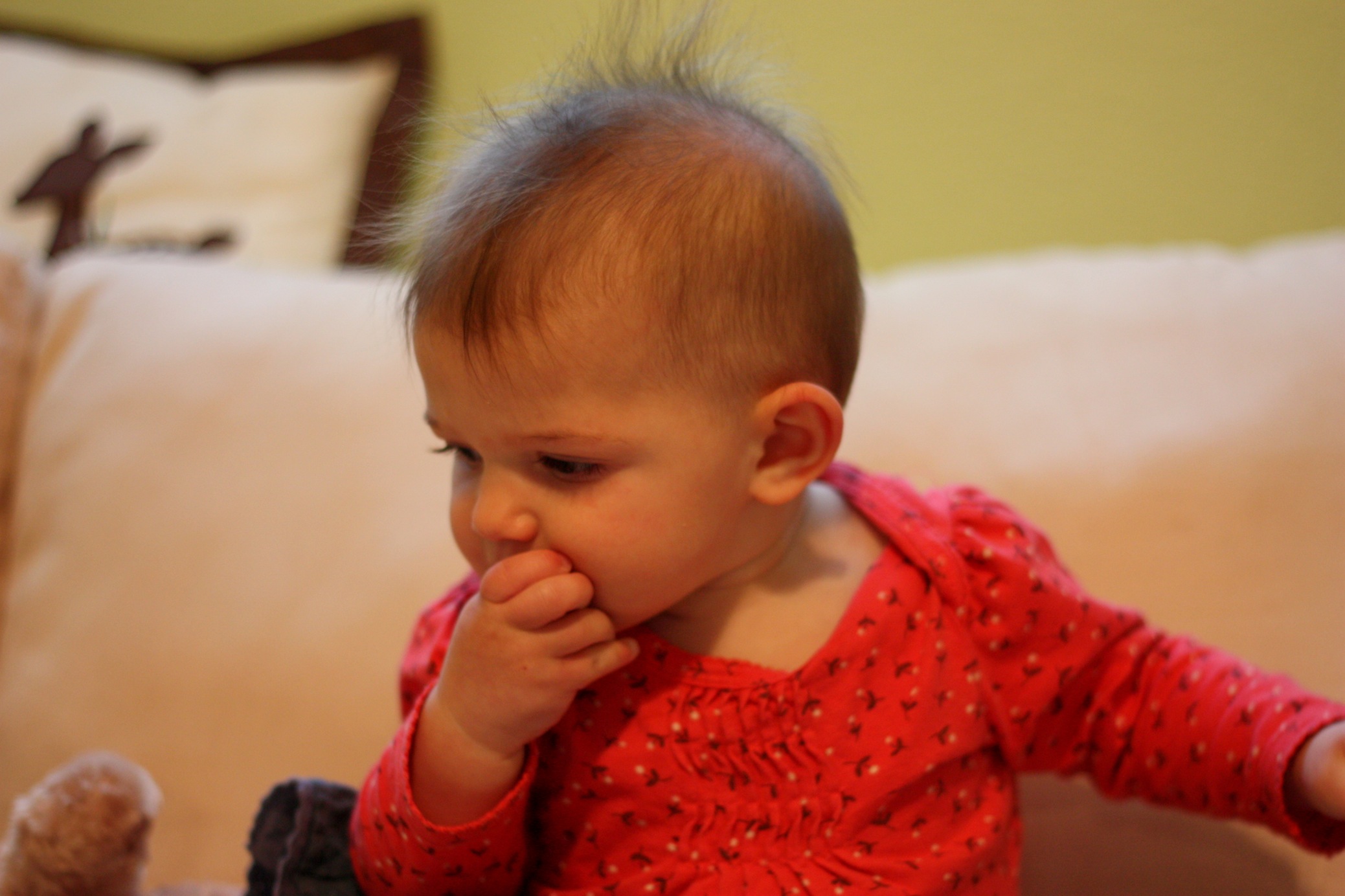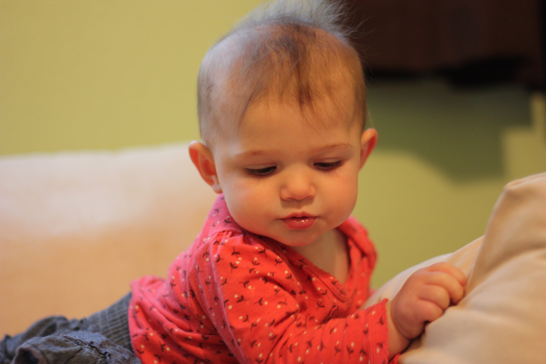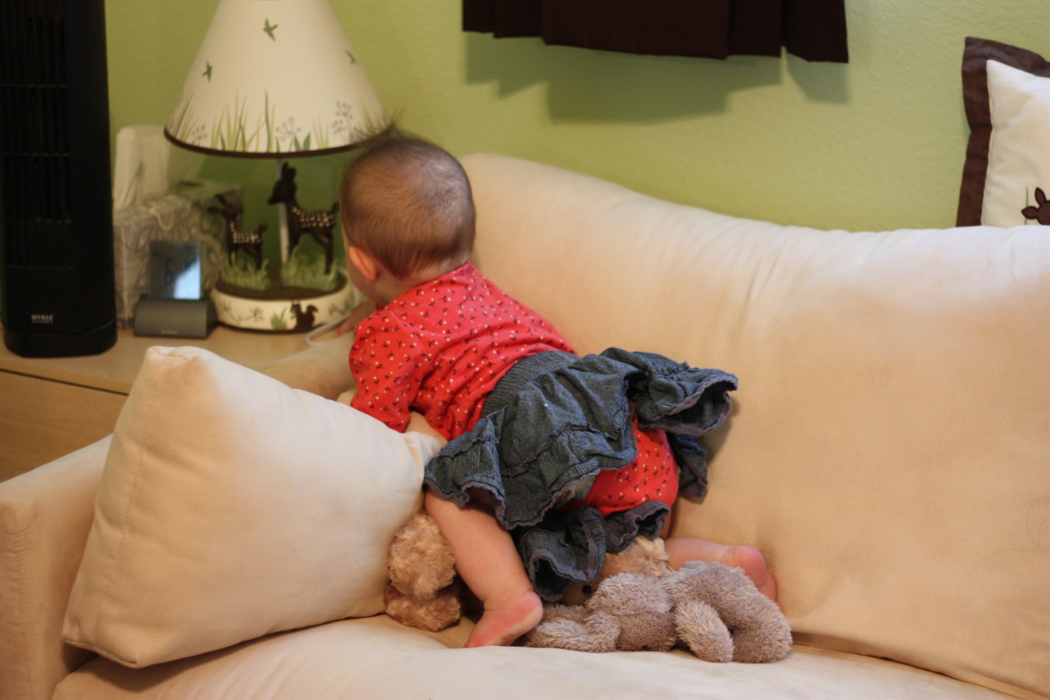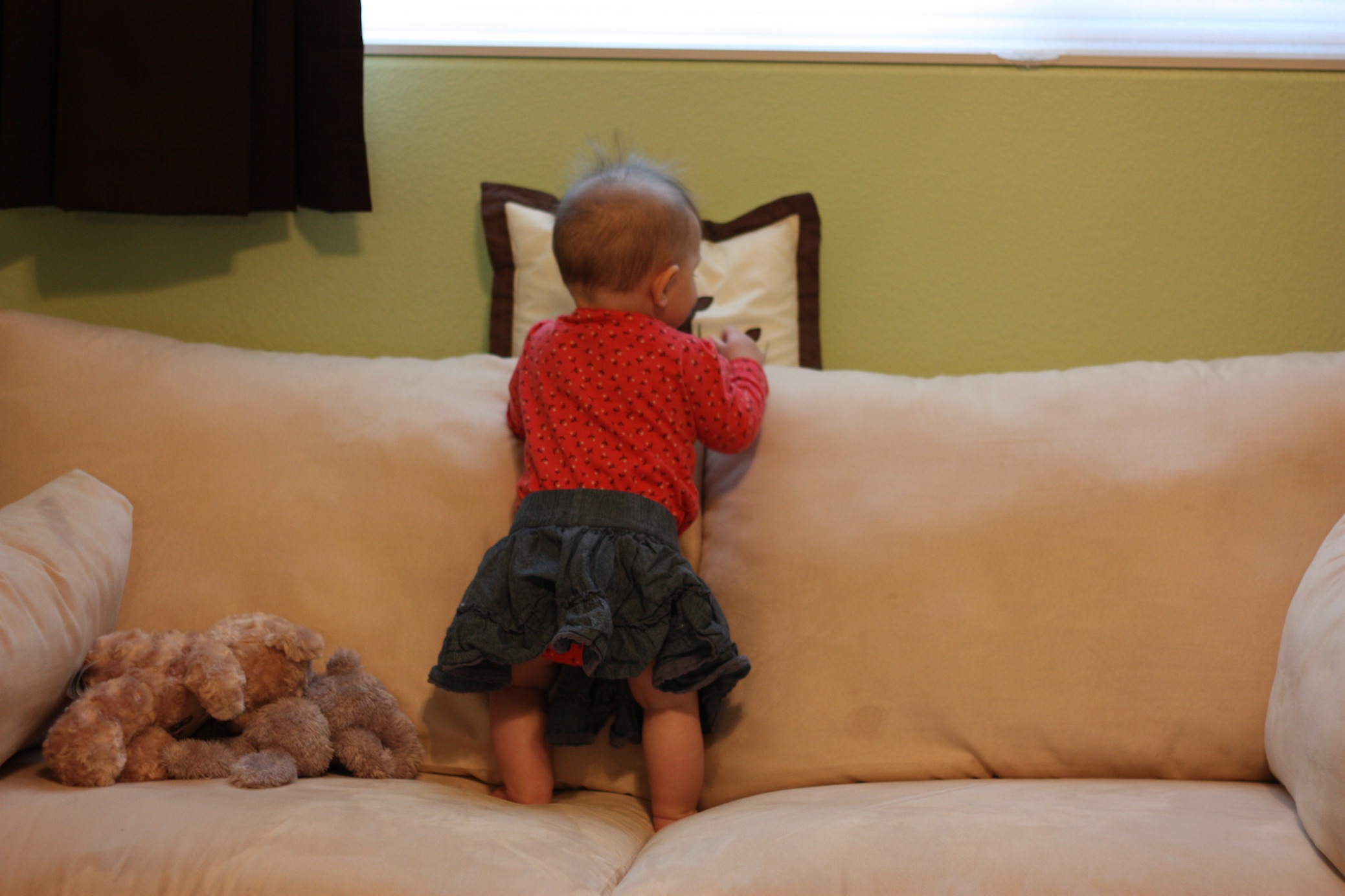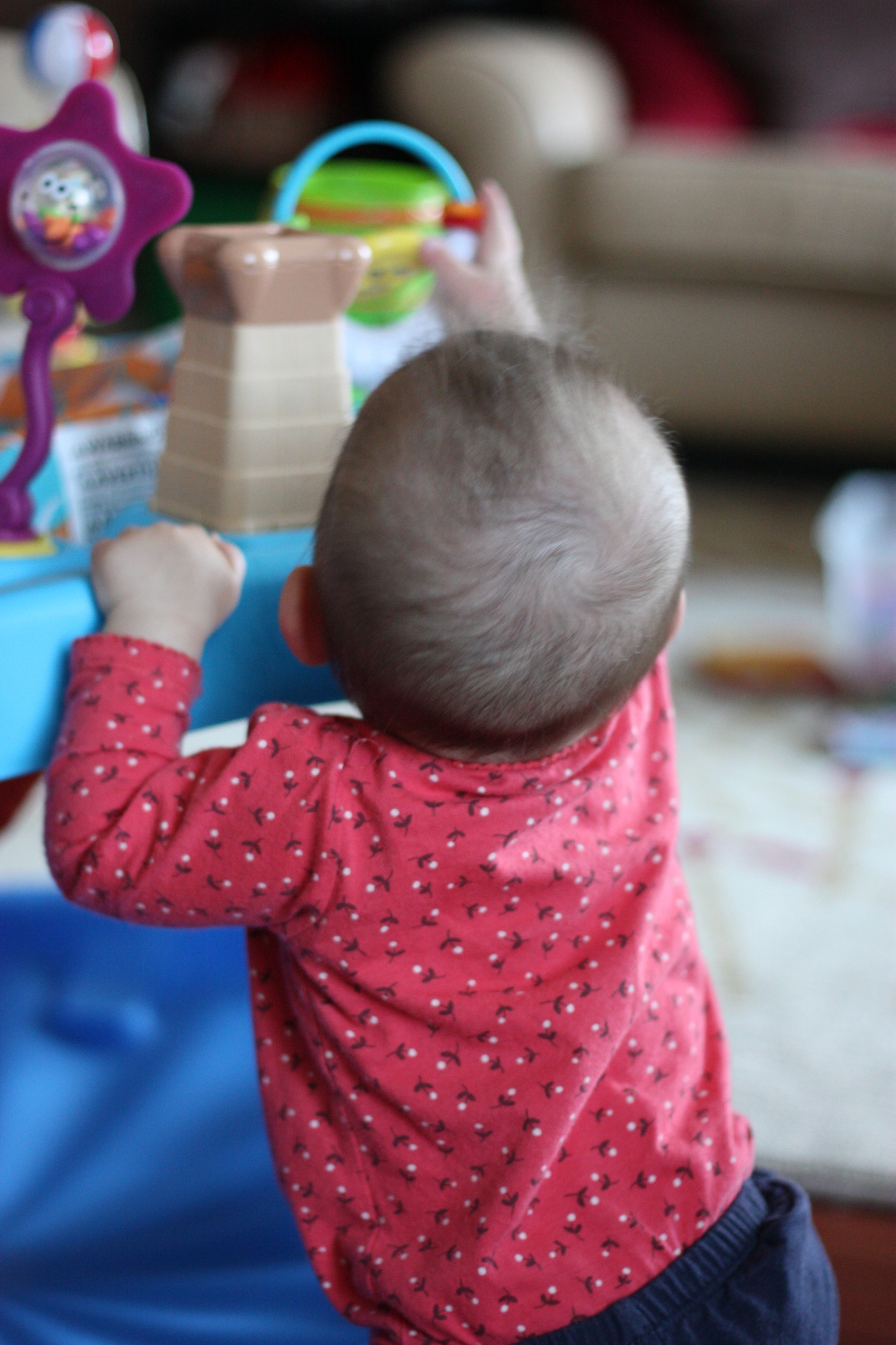 She can easily pull up to standing now, and she’ll stand and play for long periods of time. I don’t think she’s that close to walking yet, she’s not too interested in letting go. I’m perfectly happy to wait a little bit longer for that milestone to happen.