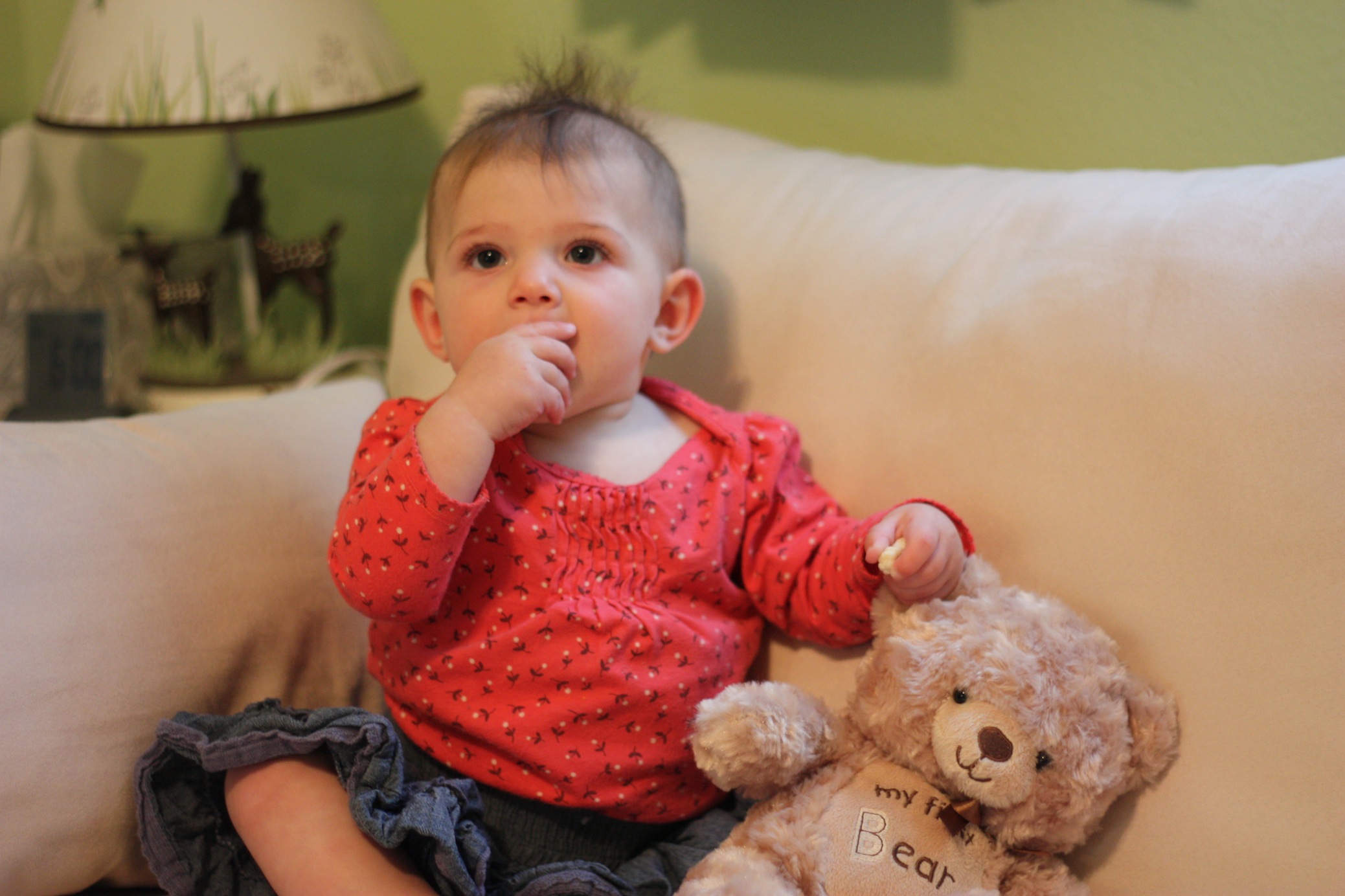 Oh my gosh, you have no idea how hard it was to get a picture of her (in focus) sitting with that teddy bear. She’s a lady on a mission nowadays and it’s impossible to keep her in one place. I even tried to bribe her with Happy Puffs and even that wasn’t enough. But who am I to keep a curious girl from exploring?
