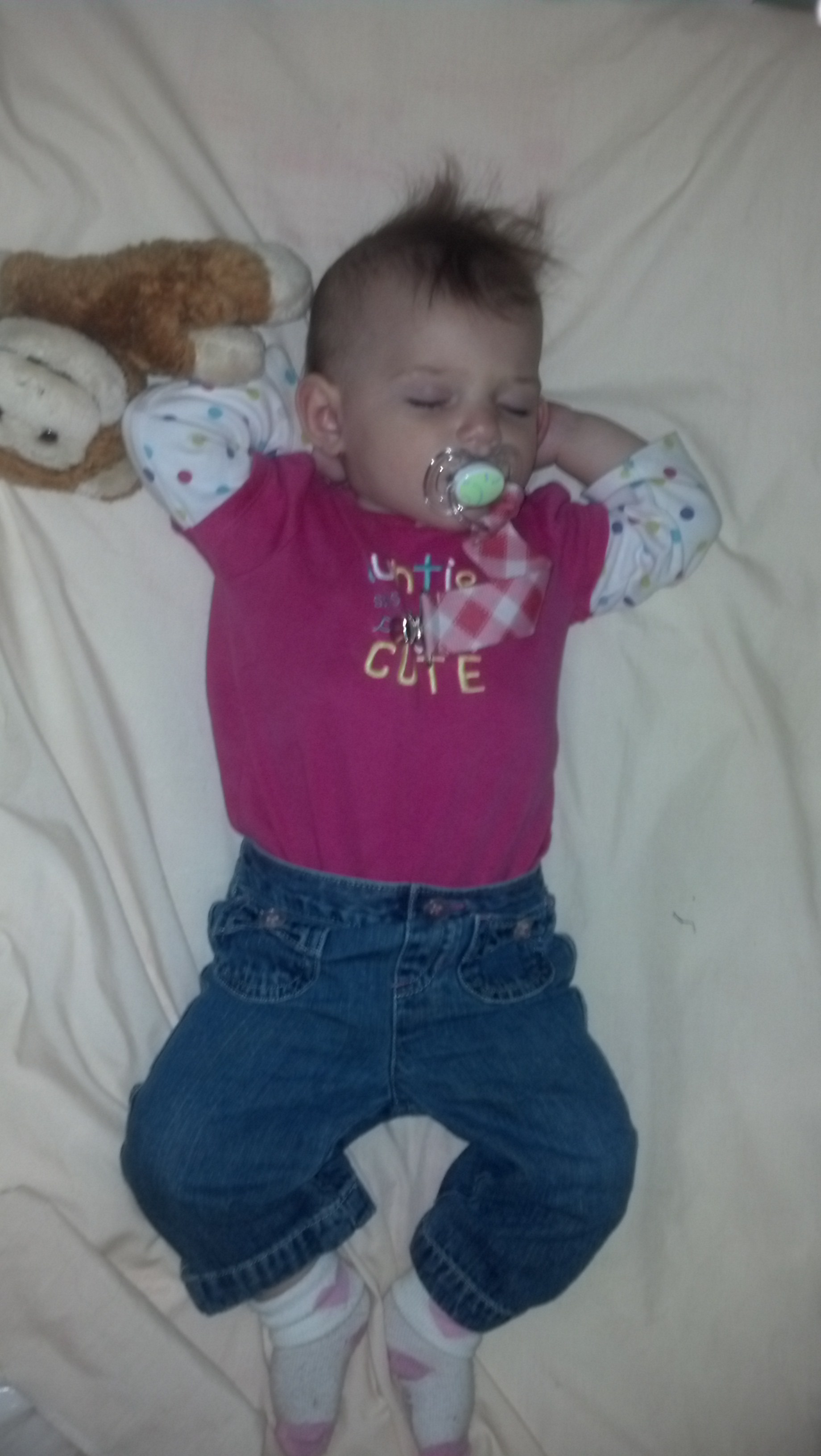Same old, same old. Goes down at 7:30p and sleeps straight til 8a the next day. She’s pretty much down to just one 1-hour nap a day now too. But if she’s really sleepy or in the car for a while, she’ll sneak in a 2nd nap in the afternoon.