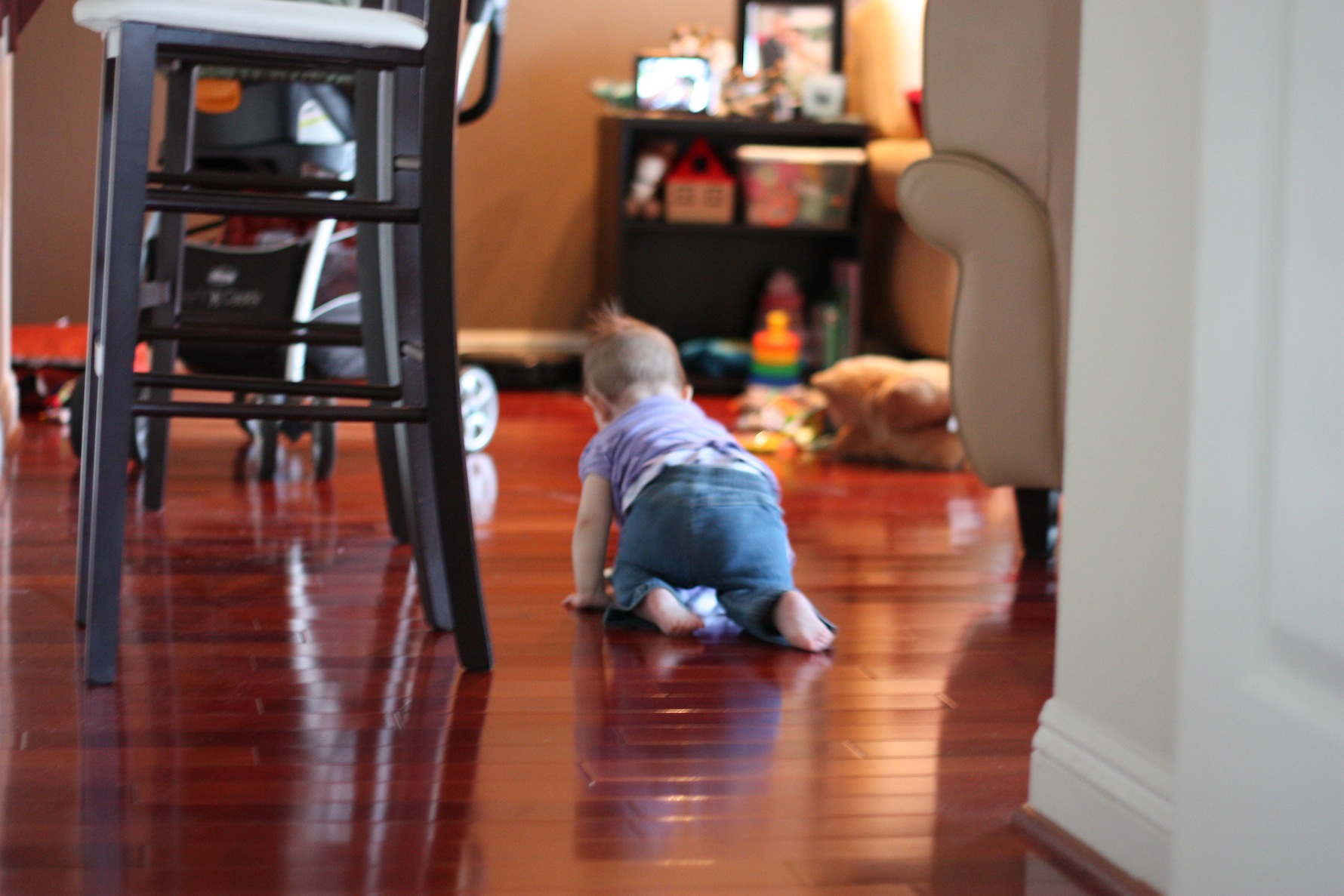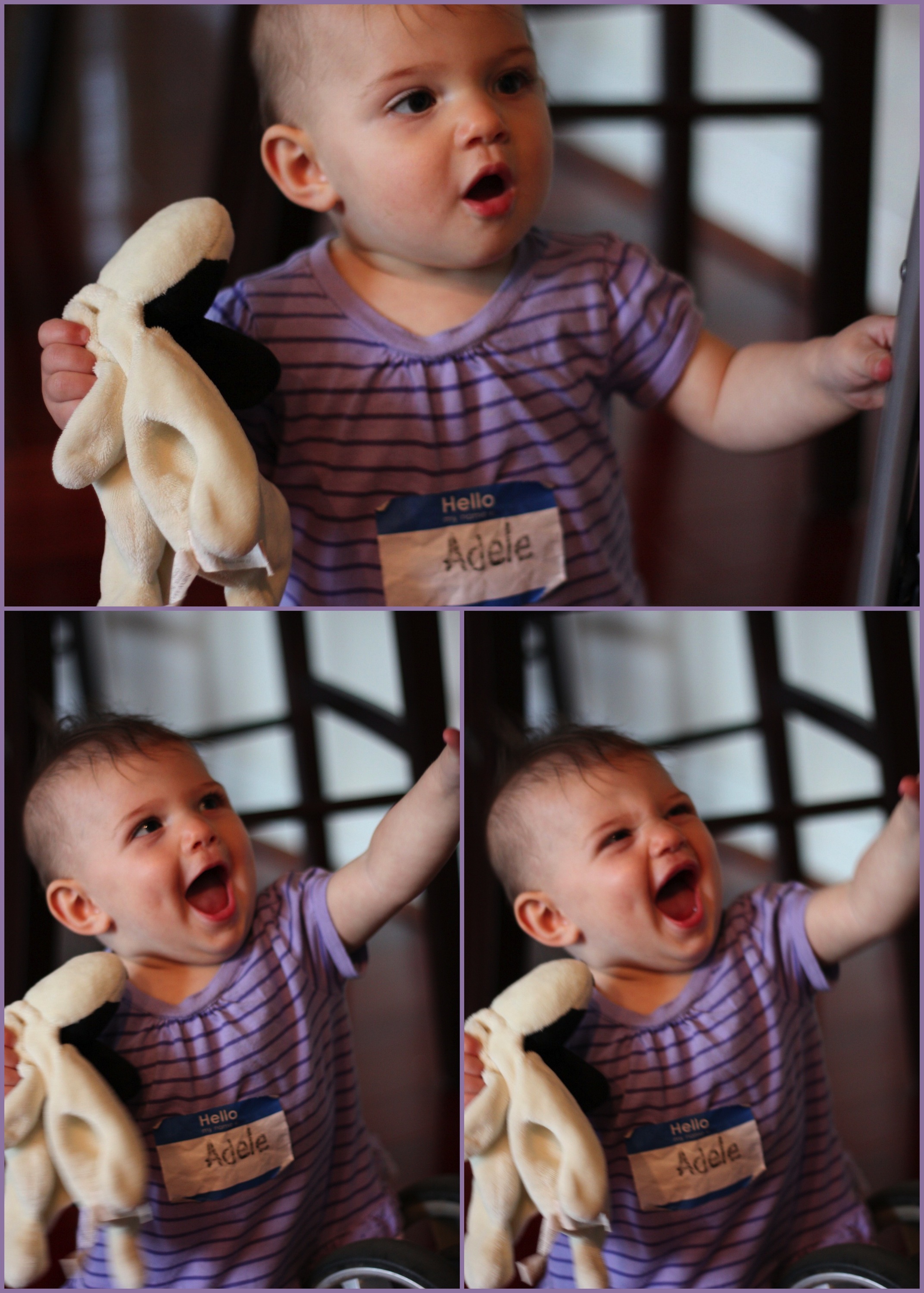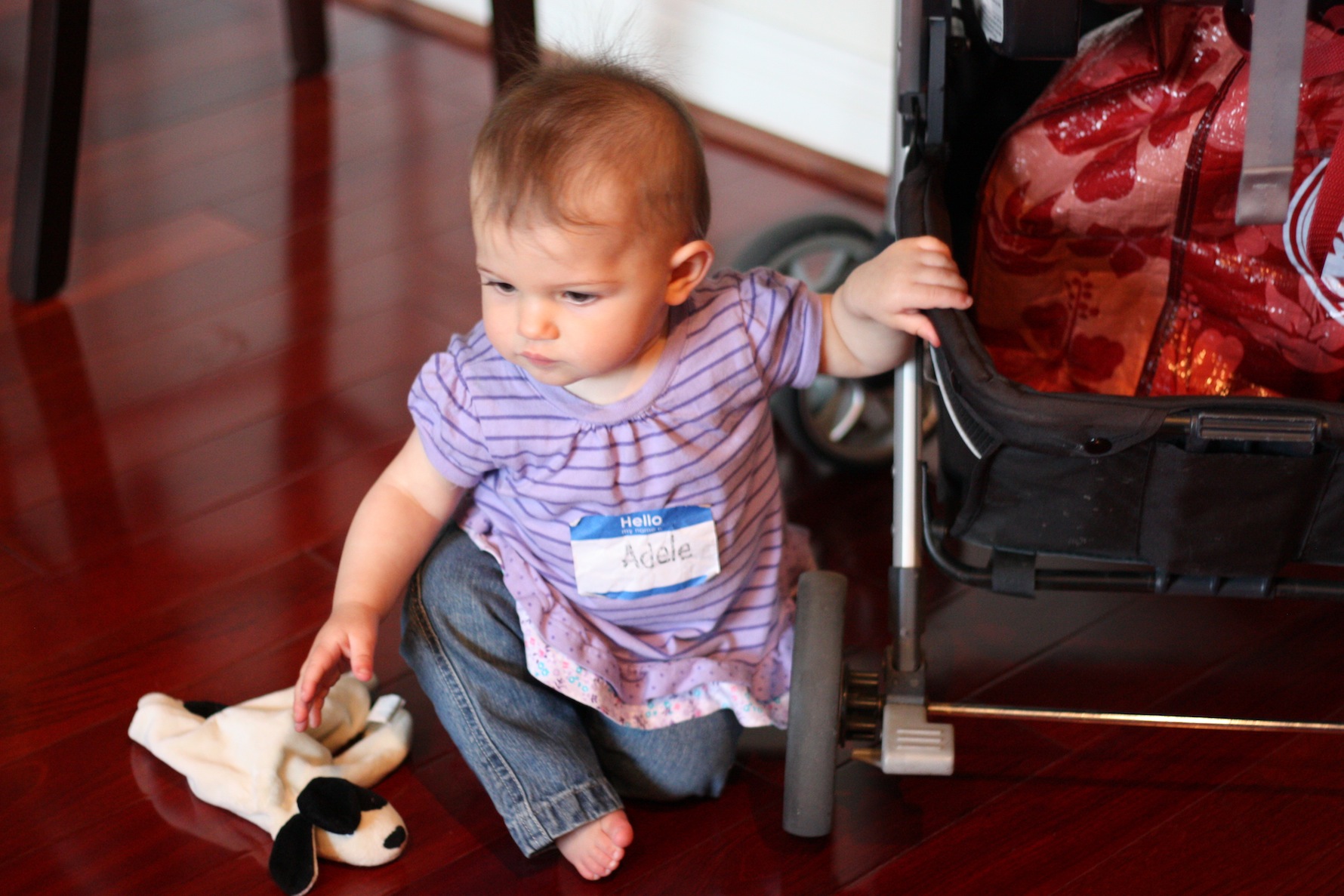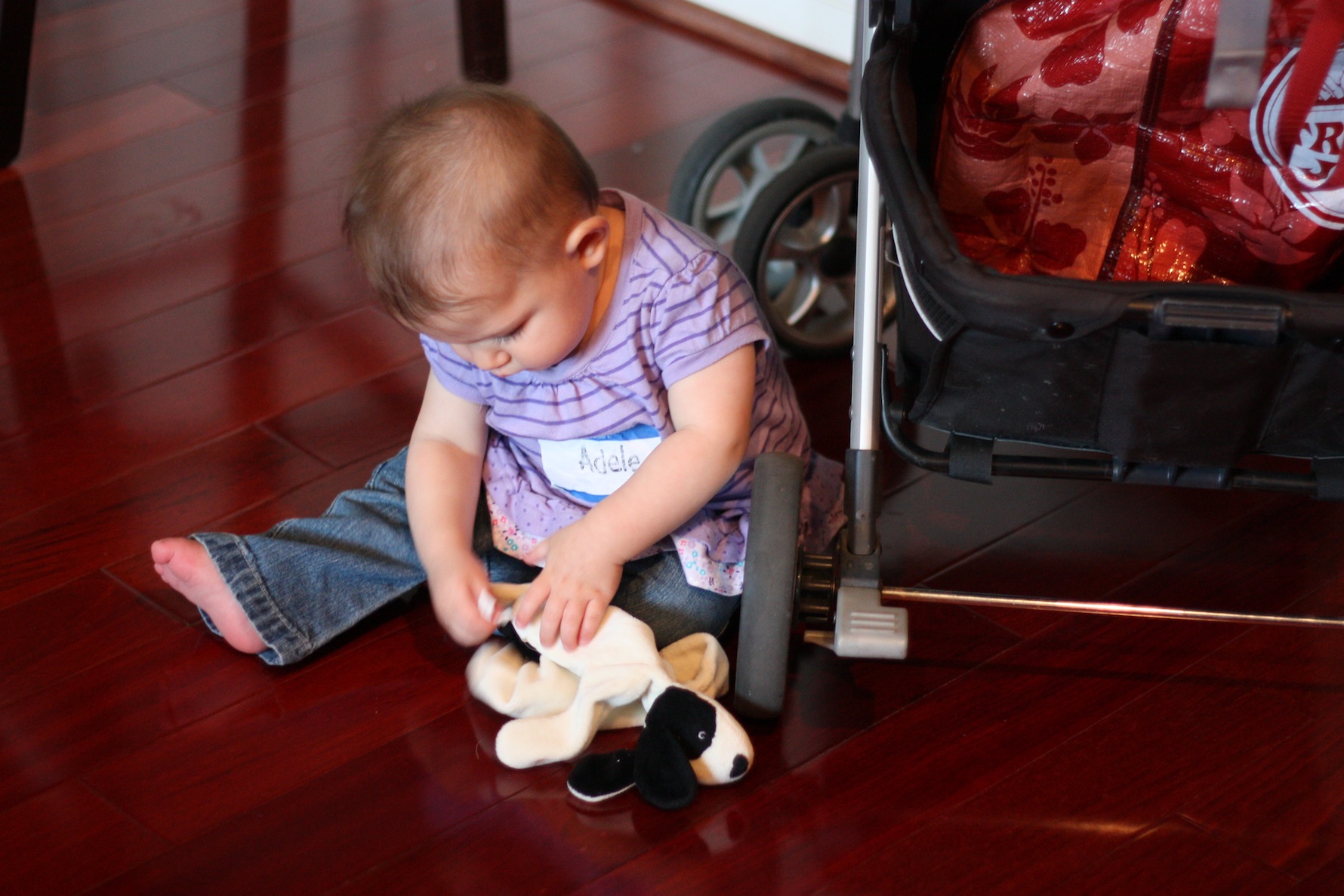 So now puppy gets to come on all of Adele’s adventures with her (around the house). She crawls around carrying him in her mouth. It’s pretty hilarious.