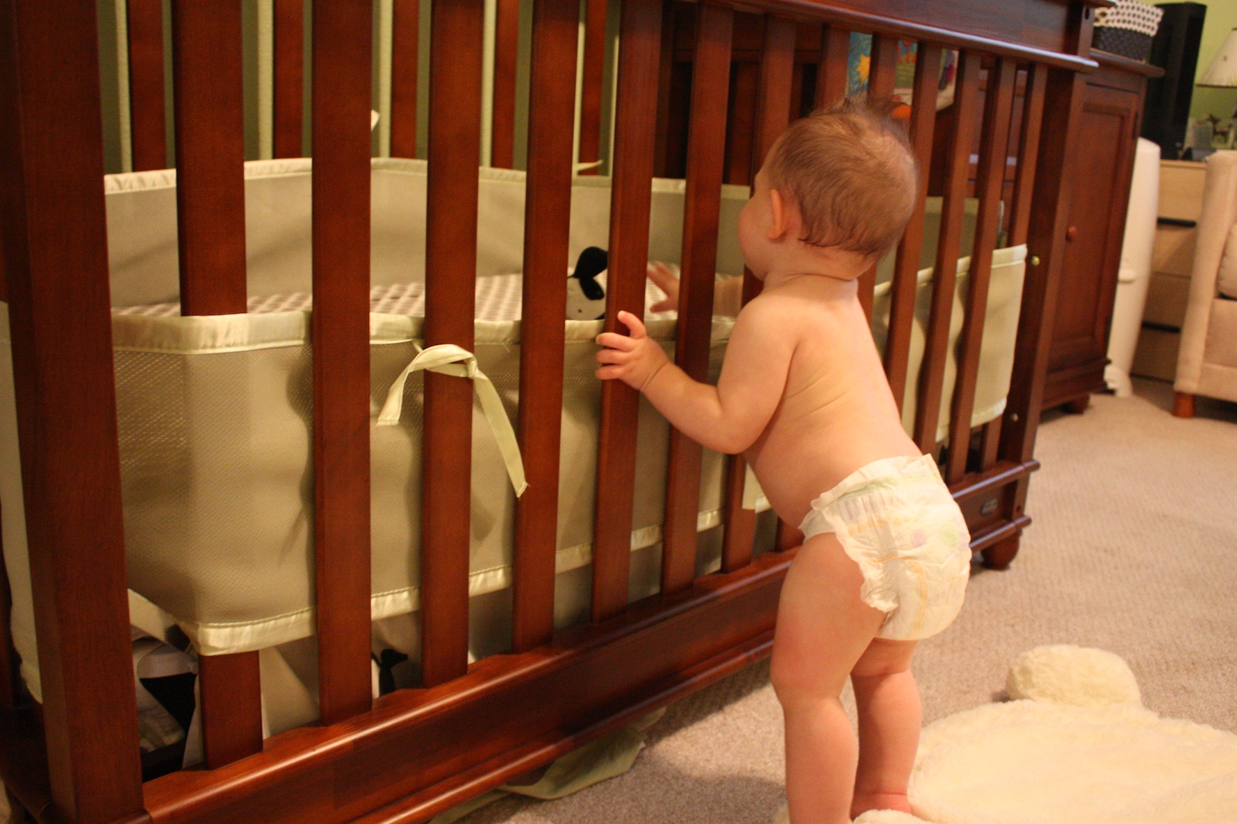 Usually, puppy stays in the crib. I wanted her to associate it with sleep, so I never let her play with it when it wsan’t time to sleep. But now that she’s mobile, she figured out that she can rescue puppy from his crib jail during the day. He’s freeeee!