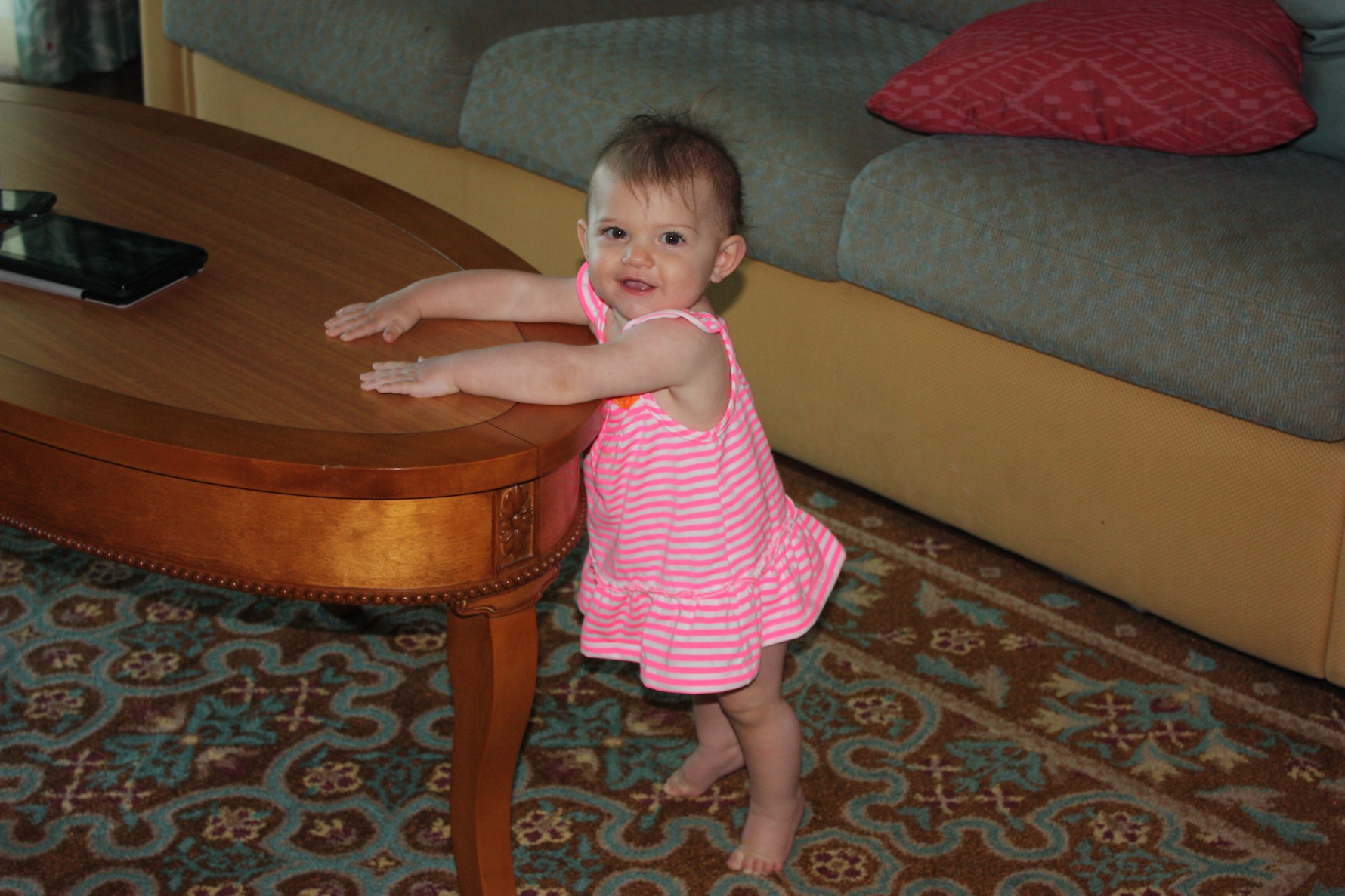 Adele is standing all the time now. She can pull up to standing by herself from a sitting position, but she’ll only do it for a few seconds at a time. She’s also cruising around the furniture now! All of a sudden it just started happening! I really think she’ll be walking by her 1st birthday. I’m not rushing anything, but that’s just my guess.