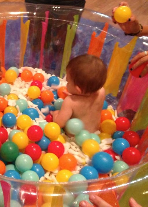 Last weekend, I took Adele to another class at “Outside the Box“. They have a new ‘messy art’ class where the babies get nice and dirty by the end. On this day, they started by putting the kids inside a pool filled with packing peanuts and plastic balls. It’s all about sensory play.