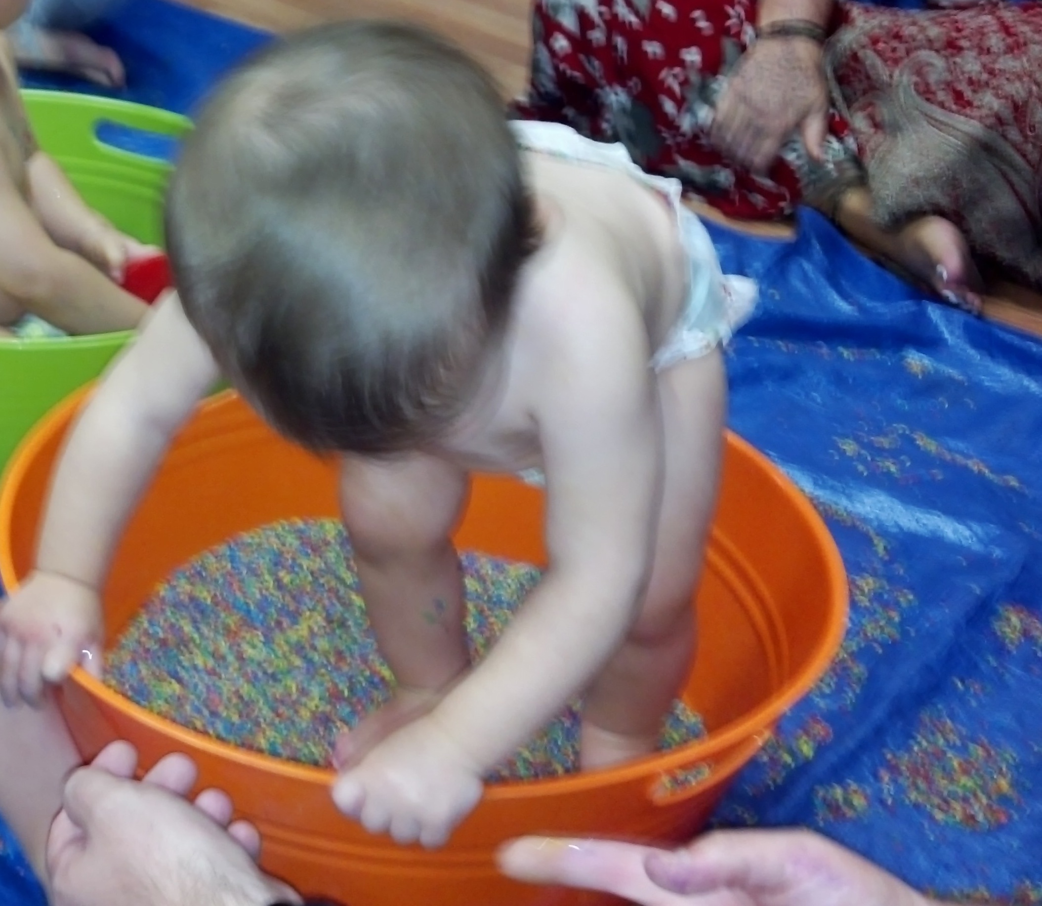 We started off with some songs. Most of the songs are in Spanish to stimulate their ears and give them some new sounds. Now, I’m constantly singing “Un Elphante, Mas Mas Grande…..” around the house. Then we Adele jumped into buckets of rice. Again, she wasn’t a fan of the texture on her skin, she was more interested in throwing the rice… at other kids. Nice.