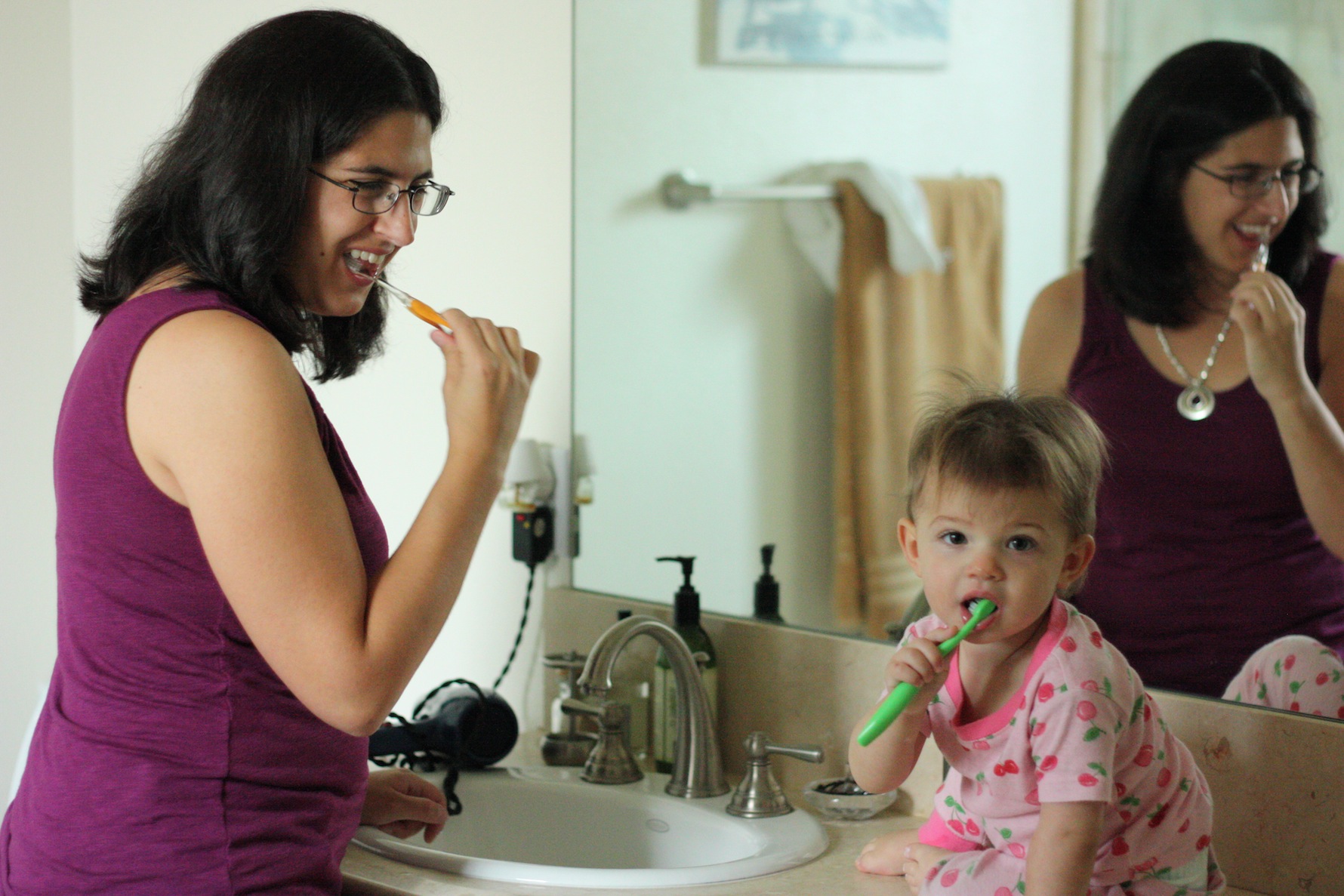 Adele now brushes her teeth with us every morning. Her favorite part is rinsing the brush and sucking the water out of it. No toothpaste yet, just water, but she thinks its hilarious. Whatever works, right?