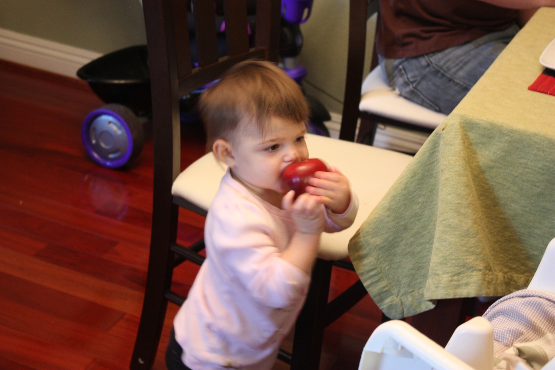 She comes to me begging for apples now. (Apple? Apple? –pronounced “app-pull”) She’ll then hold onto it and eat almost the whole thing over the course of an hour or so (the skin takes forever for her to chew.)