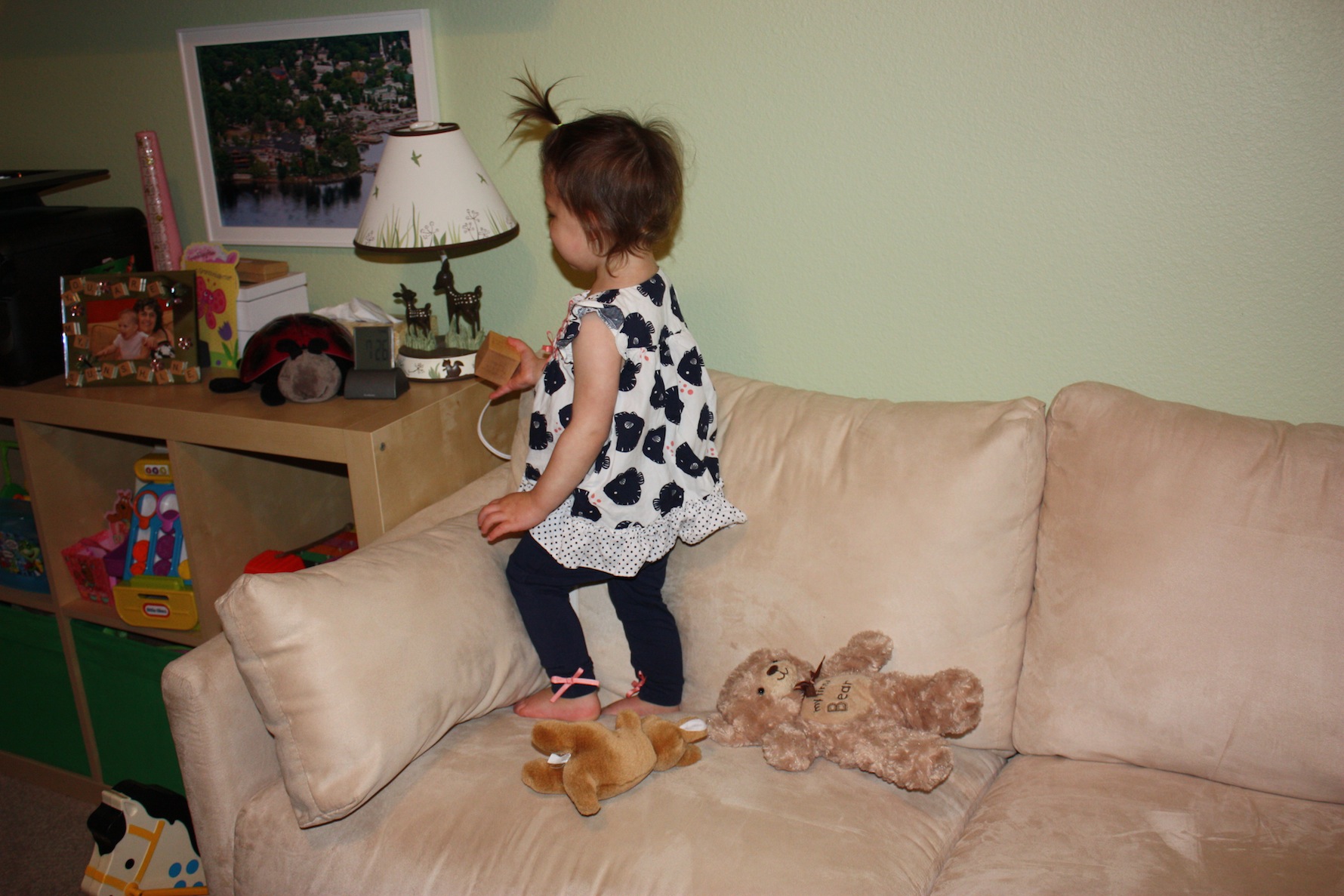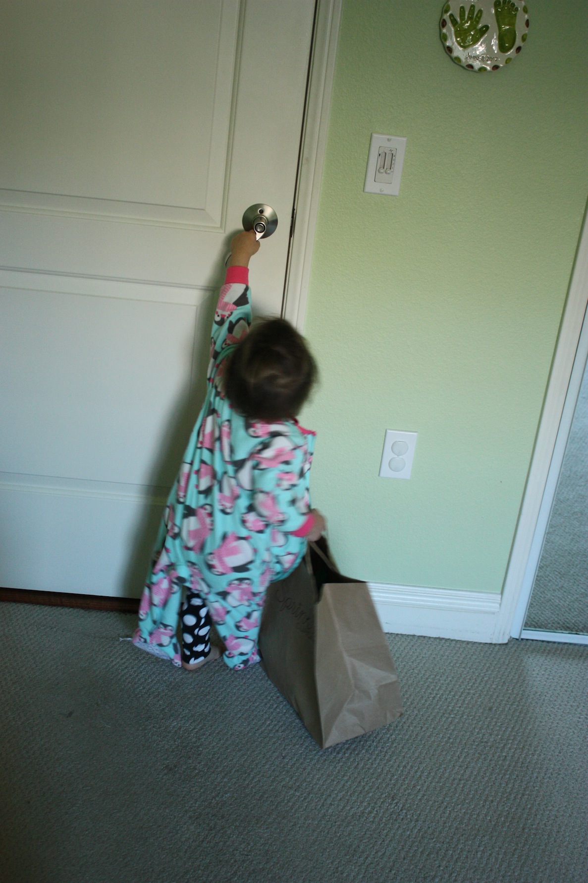 For the first time ever, she’s started to show an interest in what she’s wearing. This one cracked me up the most though. She wanted to wear her feetie fleece pajamas over her clothes… she she walked around with one foot in and one foot out for a while. haha