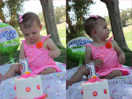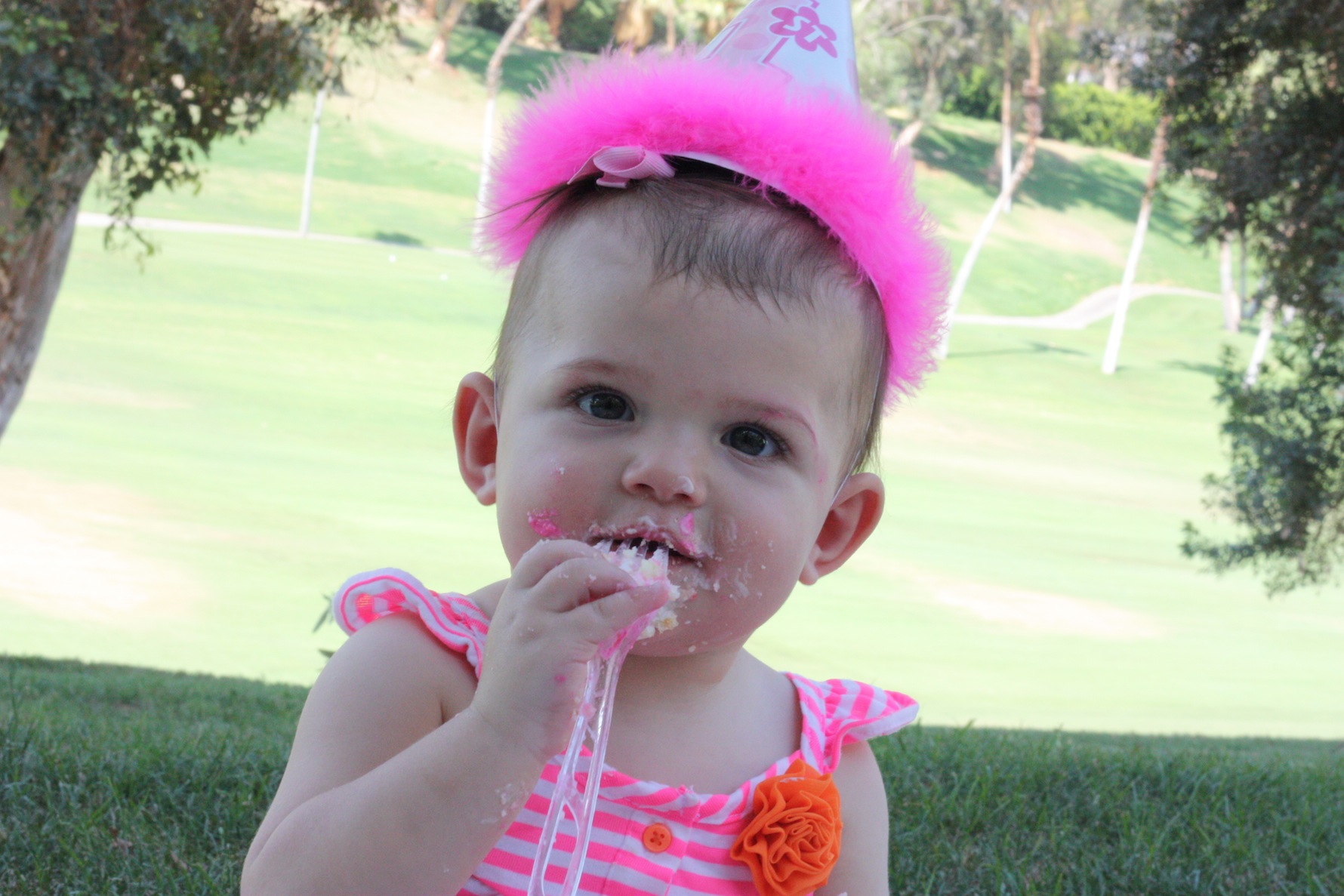After our fun lunch, we set up a drop cloth (the same one from our studio photo shoot! And… yes. It still had cake crusted on it from that cake smash.) Anyways, we found a shady spot under a big tree that looked out over the hotel golf course, and we let the birthday girl enjoy her first official birthday cake.