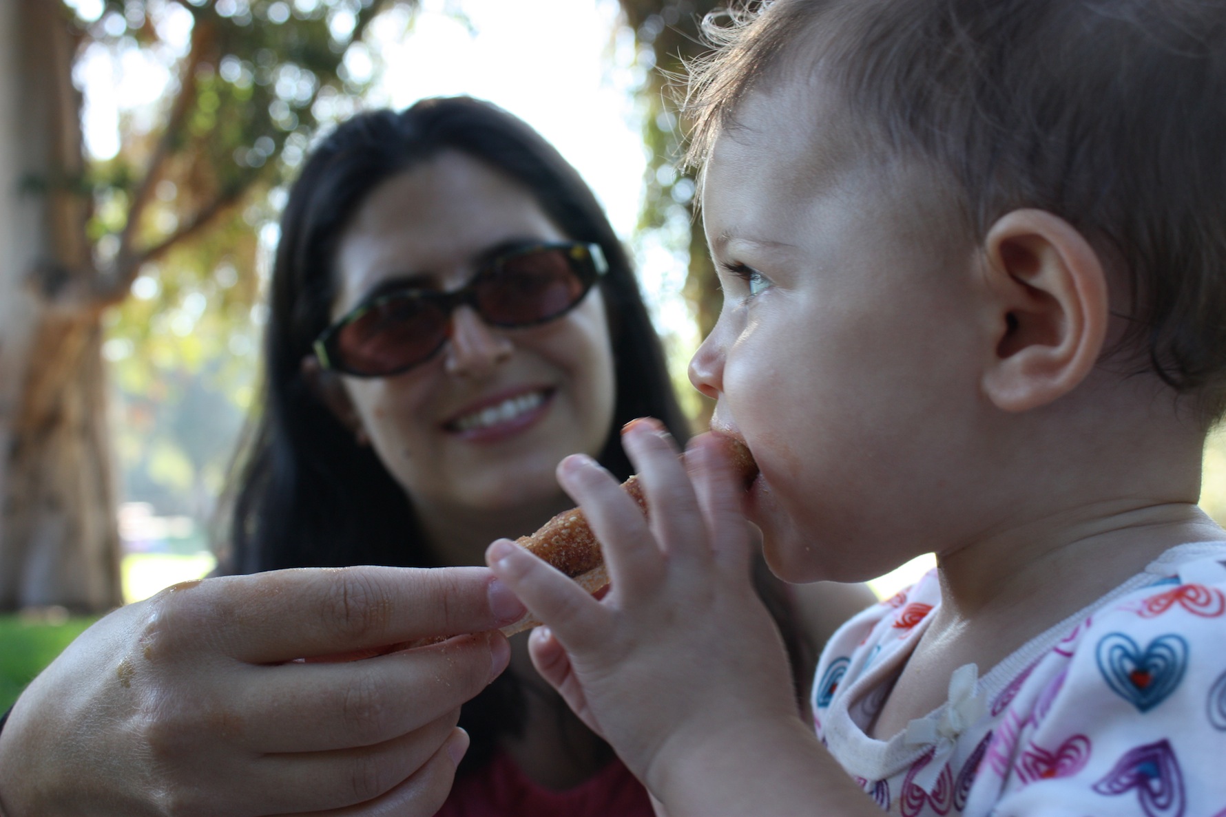 Once our food arrived, we gave Adele bites here and there. We ordered her a vegetable/farro salad, but she was really lusting after my pizza. In addition to some yummy bites with sauce and cheese, I ended up also giving her my crust to gnaw on at the end and she LOVED it. That seriously kept her busy for 20 minutes and at the end, it was pretty much gone.
