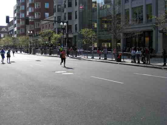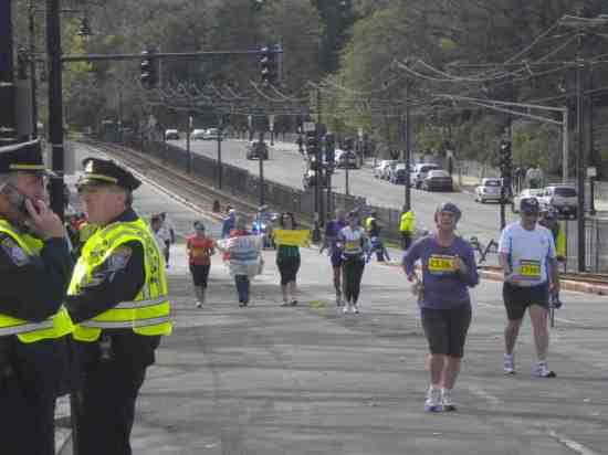 Then they jumped on the T to head to the finish line, and Irving went the last few miles with me (all the way to mile 26!) The police were threatening to open the streets to traffic, and the busses kept going by me, trying to pick me up! But I ran pieces and walked really, really fast and they left me alone. 🙂