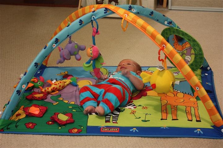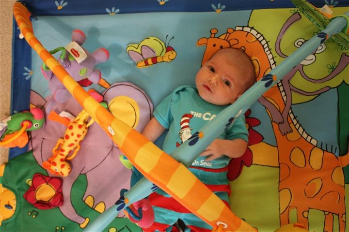 6:15p – Cook Dinner. Adele woke up in a good mood, so I dragged her exersaucer over to the kitchen so she could play while I cooked. She was loving it. She’s in a stage now where she cries whenever I leave her sight. So she’s happy as long as she can see me.